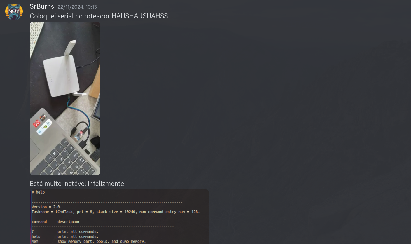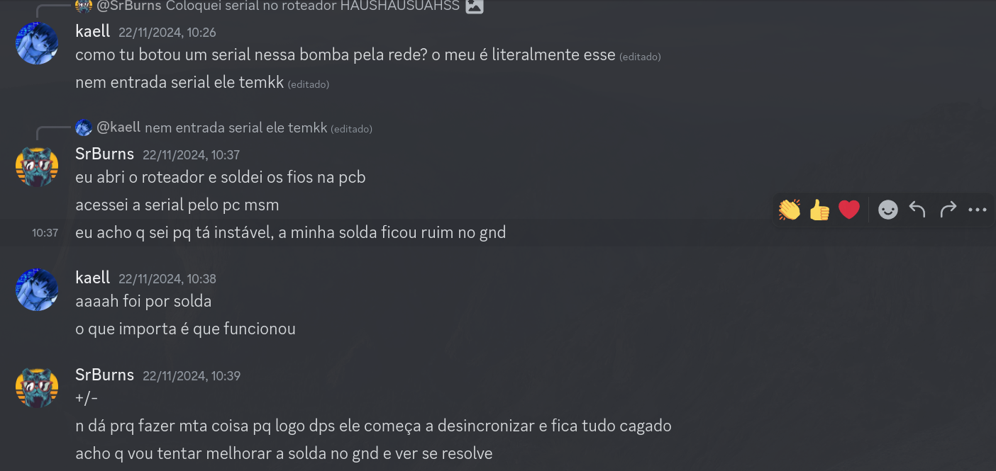 Também temos que tentar adivinhar alguns comportamentos estranhos, por exemplo, qual taxa será que esse serial usa? Será que é constante? Isso é uma cifra ou eu que fiz merda? Ficam as questões.