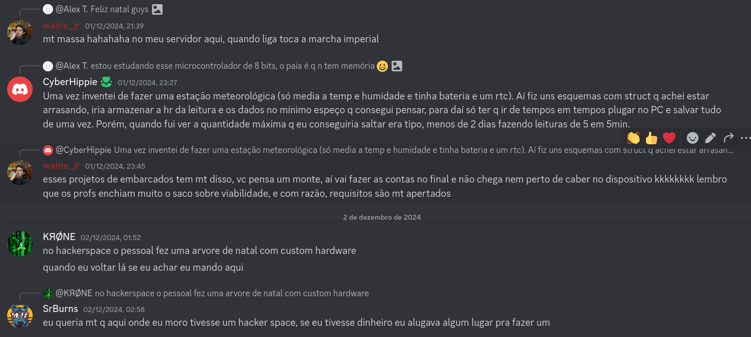 Rolou também uma longa discussão sobre RTOS (sistema operacional de tempo real, muito comum em embarcados), dual ou single core, FreeRTOS e as habilidades para embarcar nesse mundo. Convido quem se interessa pelo assunto ler lá no Discord (a partir daqui).